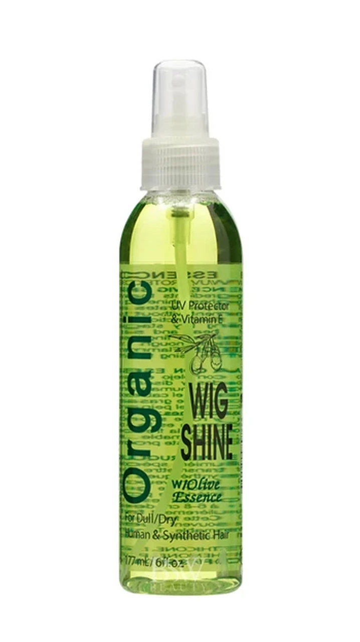Bonfi Natural Organic Wig Shine with Olive Essence for Dull/Dry, Human & Synthetic Hair. Contains a unique special light complex of ingredients that was formulated and designed to impart the highest shine possible on Human & Synthetic Hair and Wigs. It penetrates quickly so that the hair retains freedom of movement without the heavy greasy feel. It also decreases inner fiber friction to ease combing and minimize breakage during Dry stages.