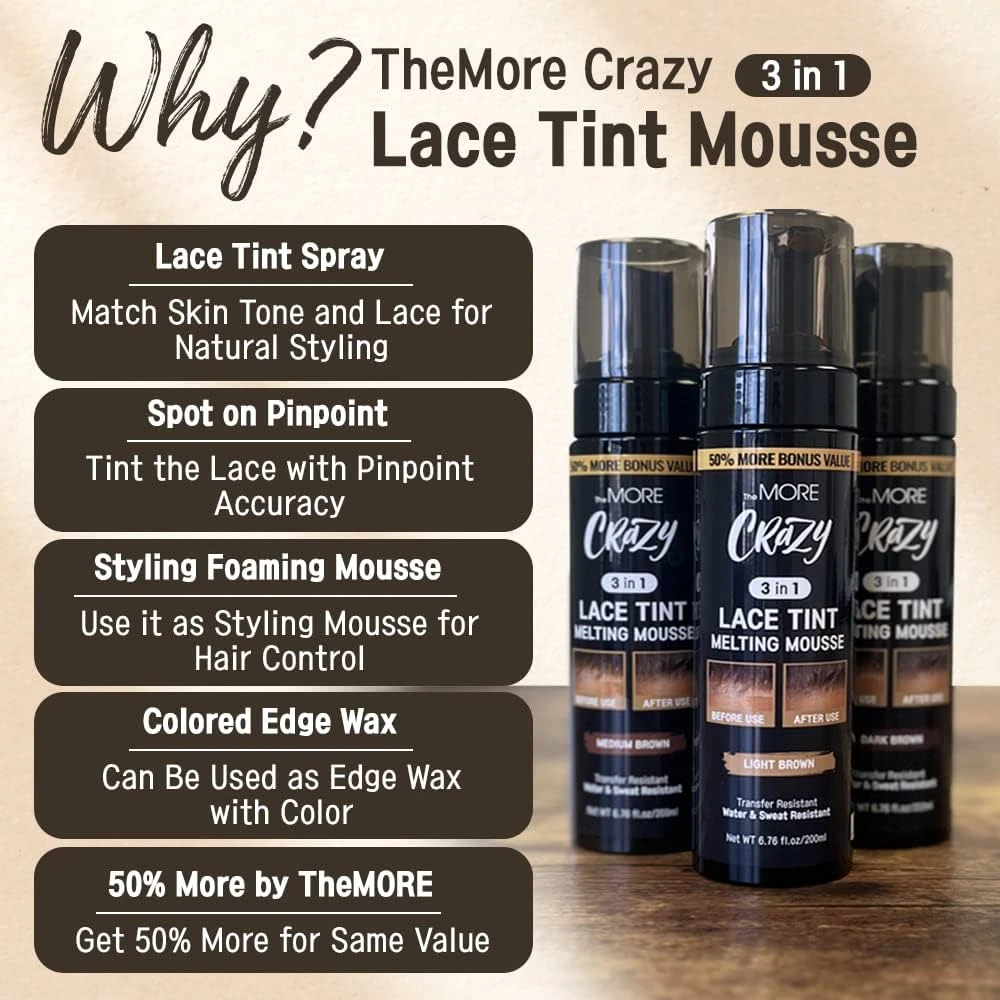 The MORE 3 in 1 Lace Tint Mousse, 6.76 Fl Oz, Light Brown | Concealer for Lace Wigs, Hair Wigs, Toupees and Hair Pieces, Colored Edge Tamer