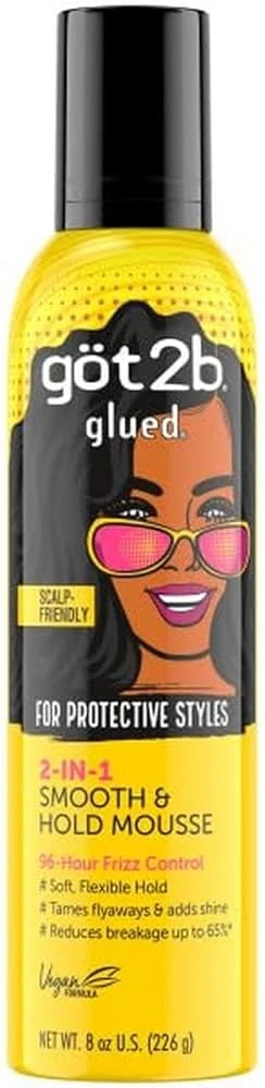 Got2b Glued 2-in-1 Smooth & Hold Mousse holds your protective style in place with 96-hour frizz control. Got2b clinically tested, scalp-friendly formula is designed to provide a soft, flexible hold and smooths hair to keep your protective style in place.
