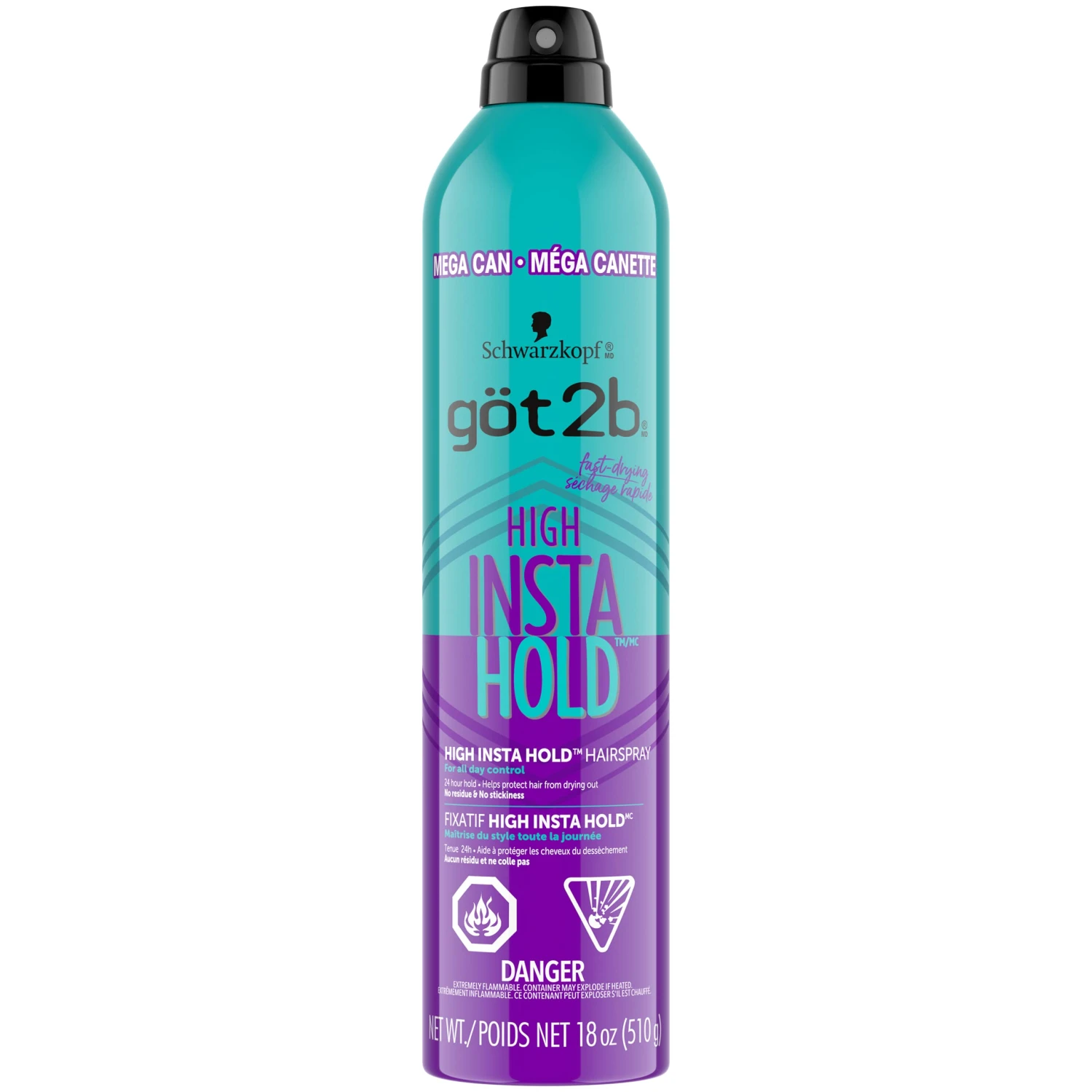 - NO STICKINESS OR RESIDUE: This hairspray has no stickiness and leaves no residue. MEGA SIZE: This got2b Insta high hold hairspray is with the same great formula and hold as our 9.1oz Insta high hold hair spray can.