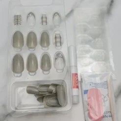 Kit includes 24 nails of different sizes, 1 Nail glue, 12 nail stickers, two prep pads, file, Manicure wood stick