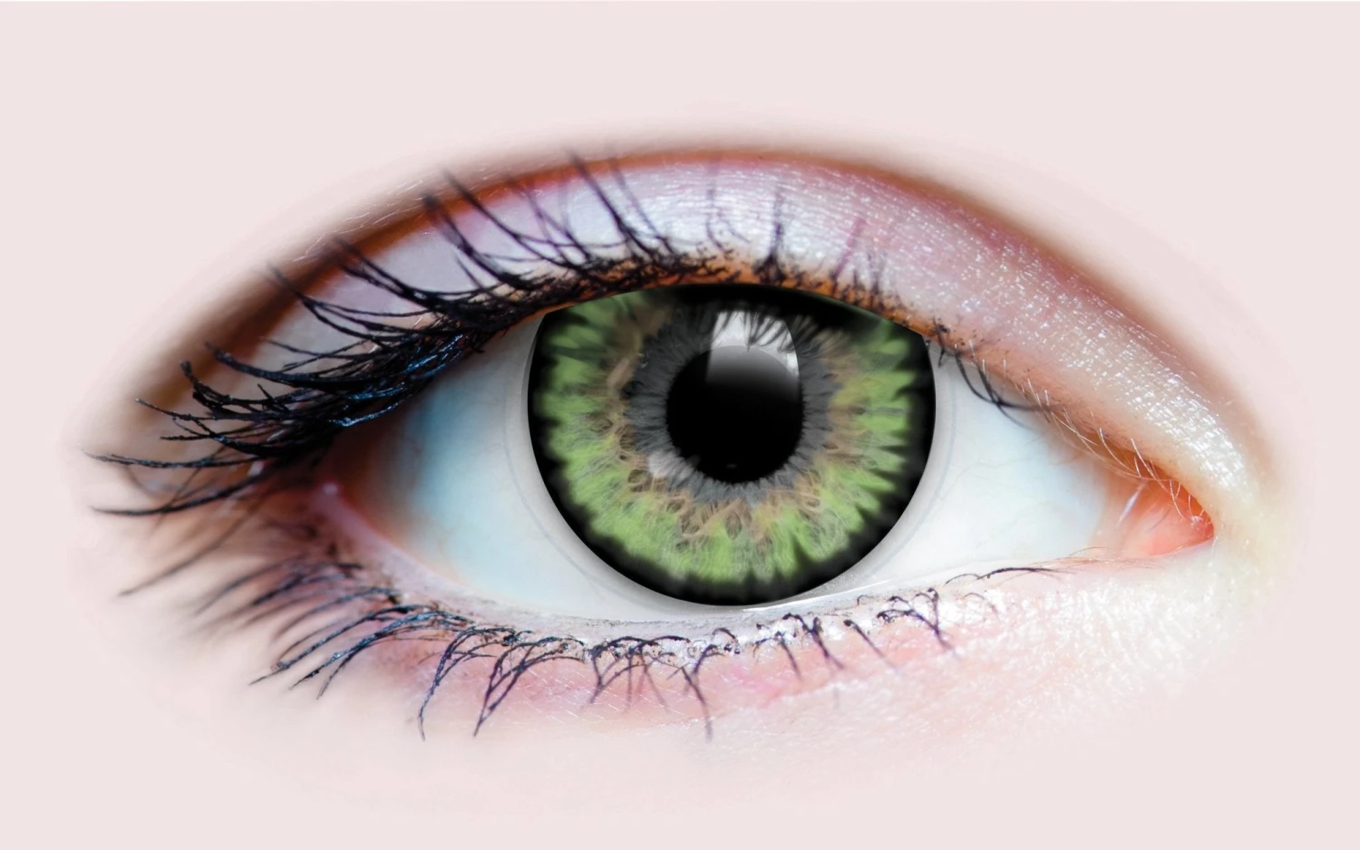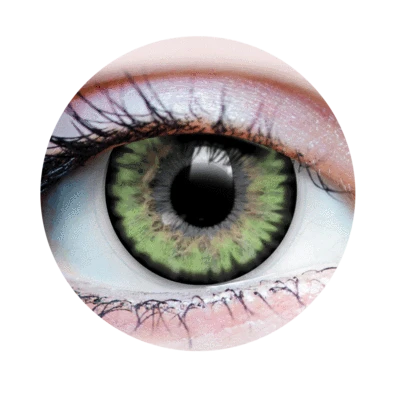 On light natural eyes, these colored contact lenses shine in luminous light green shades, with the outer ring marking a dramatic contrast.
