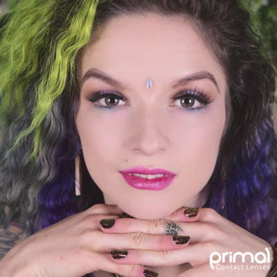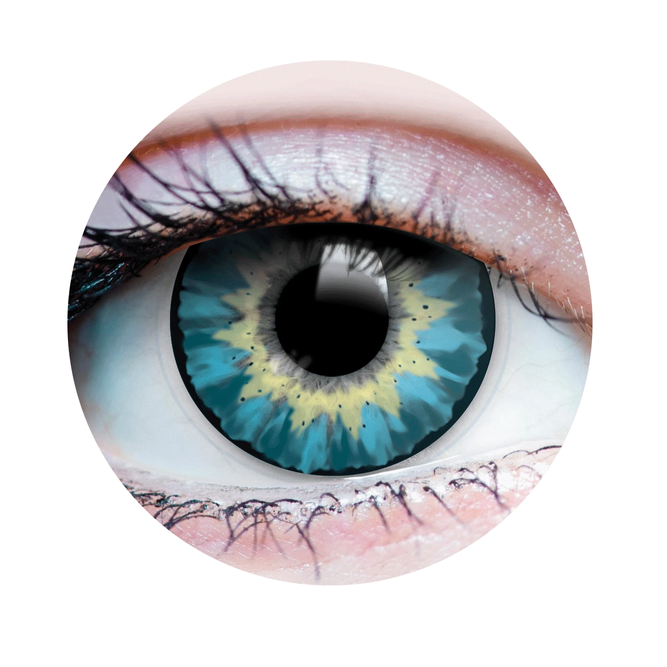DELIGHTFUL AZURE circle lenses feature a delicate and textured layering of blue, turquoise and ash tones, that radiate throughout the iris to meet a dark brown outer circle.