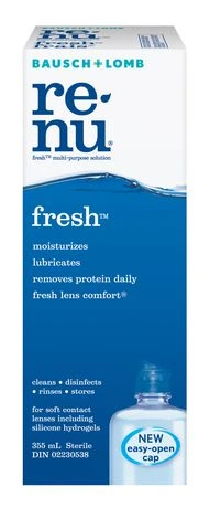 Renu® fresh™ multi-purpose solution is specially formulated to work with your natural tears. Experience the feeling of wearing a fresh pair of lenses cushioned in moisture. renu® fresh™ is proven to fight germs, clean lenses, and remove irritating protein deposits daily from your soft contact lenses. Daily use of renu® fresh™ multi-purpose solution eliminates the need for a separate enzymatic cleaner or daily cleaner for many lens wearers—consult your health care professional.