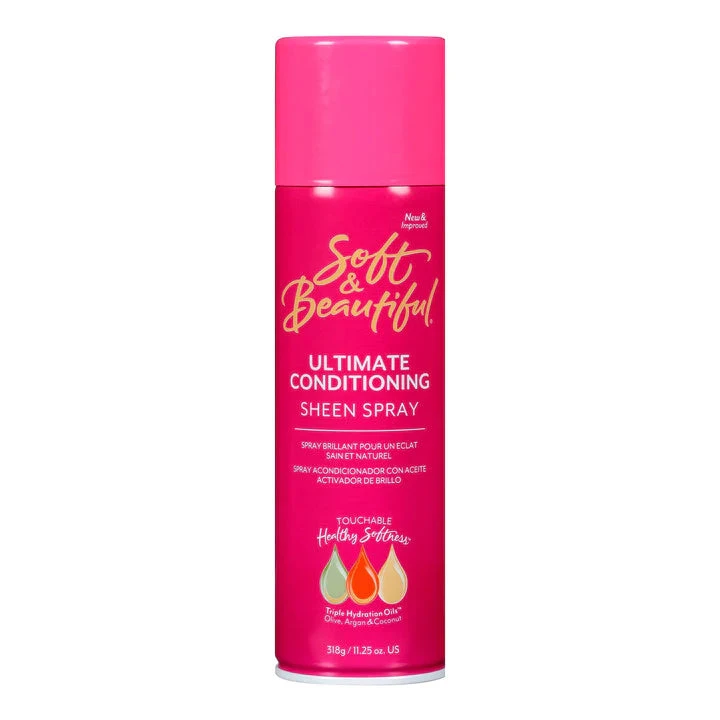 Infused with jojoba and almond oils to silken, nourish, and strengthen hair, Soft & Beautiful Ultimate Conditioning Sheen Spray adds weightless sheen for shiny, touchable, soft hair .